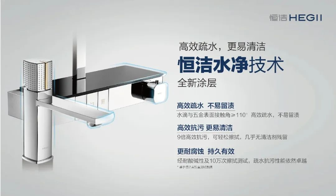 再如,衛(wèi)浴生活中長期存在的痛點(diǎn)——水垢和污漬。水龍頭、花灑等衛(wèi)浴五金,使用過后一旦清潔不及時(shí)就容易水漬斑斑,甚至生銹,不僅會(huì)讓衛(wèi)浴五金失去光澤,還容易滋生細(xì)菌。雖然網(wǎng)上針對(duì)水垢的清除,有各種各樣的方法,但大多治標(biāo)不治本。恒潔創(chuàng)新推出的水凈技術(shù),直擊水垢、污漬等痛點(diǎn),從源頭上解決衛(wèi)浴產(chǎn)品的清潔難題。目前,恒潔水凈技術(shù)已經(jīng)應(yīng)用在恒潔坐便器、花灑和水龍頭等多種產(chǎn)品上,以實(shí)用科技助力用戶升級(jí)品質(zhì)生活。