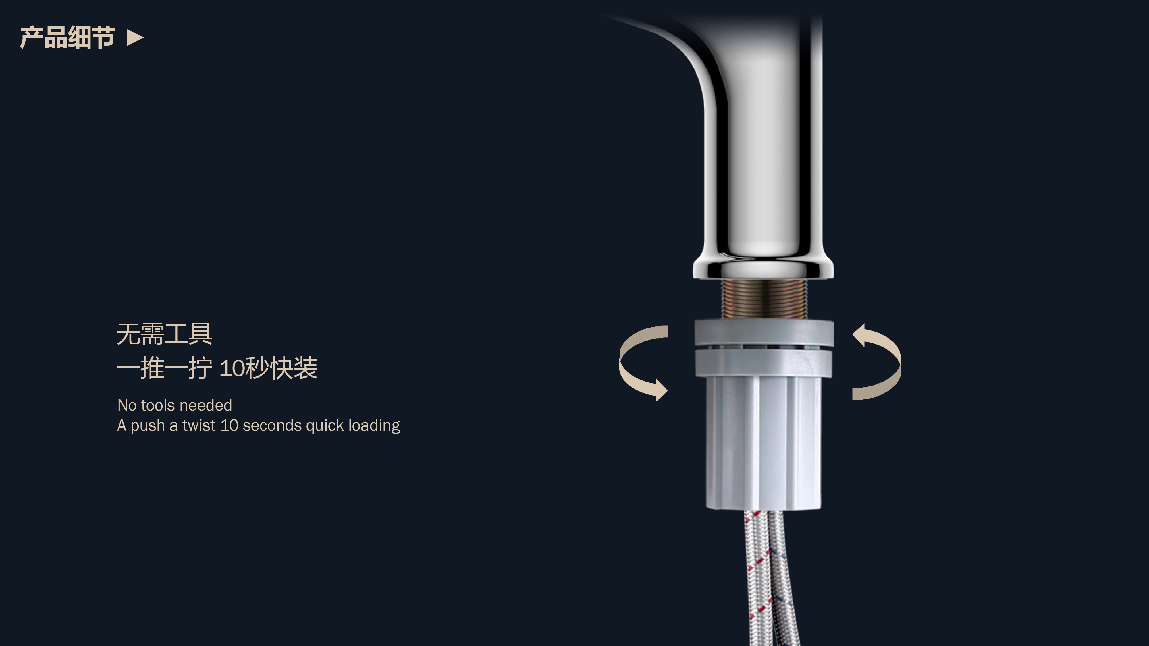 360°全方位抽拉清洗;微光龍頭,深夜使用不開大燈,不刺眼;日常洗頭利器,抽拉出水輕松洗;按壓切換兩功能水花;三種顏色LED燈光顯示水溫;重力錘復(fù)位設(shè)計(jì),順暢伸縮,精準(zhǔn)回位;無需工具,一推一擰10秒快裝