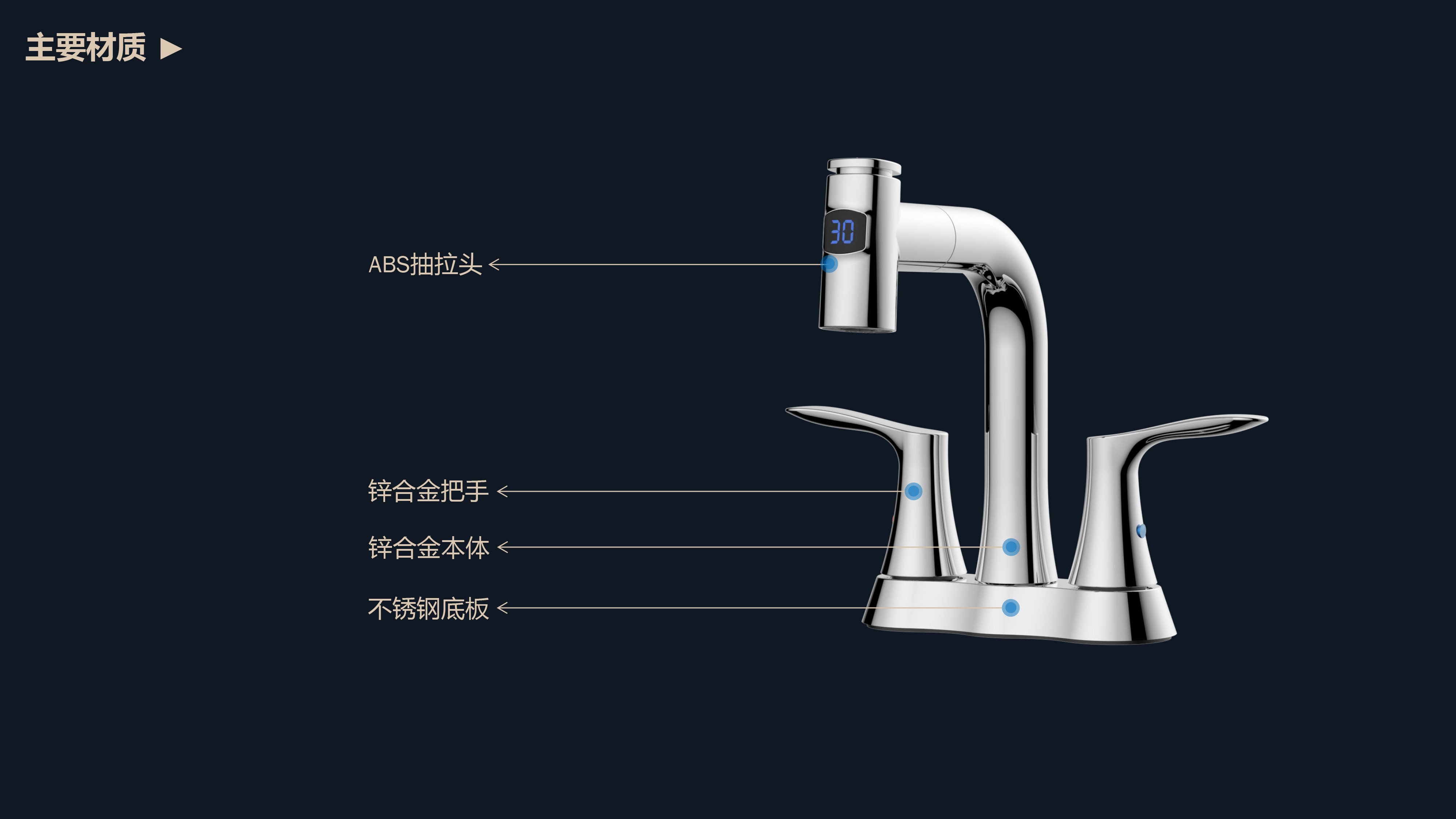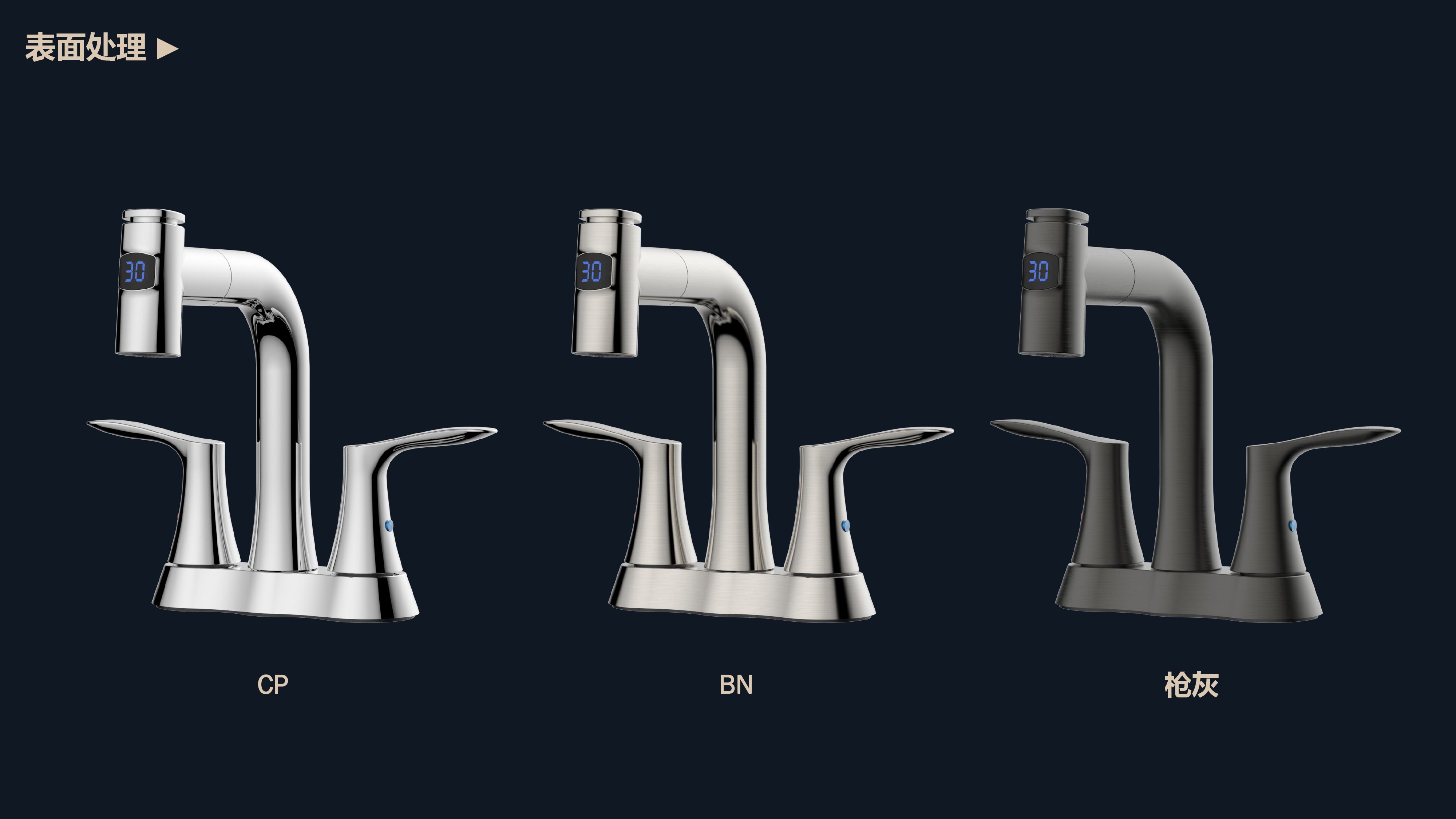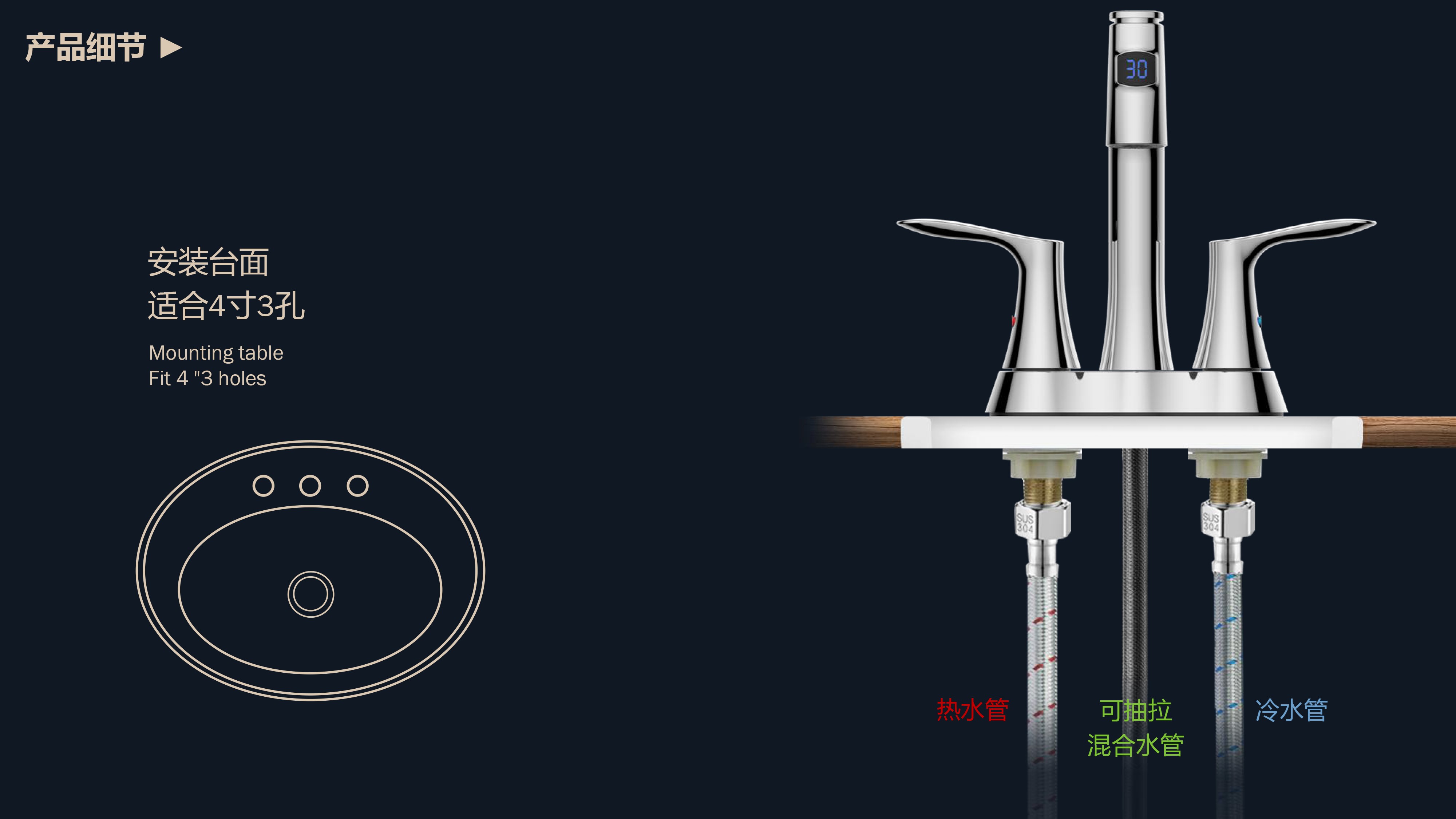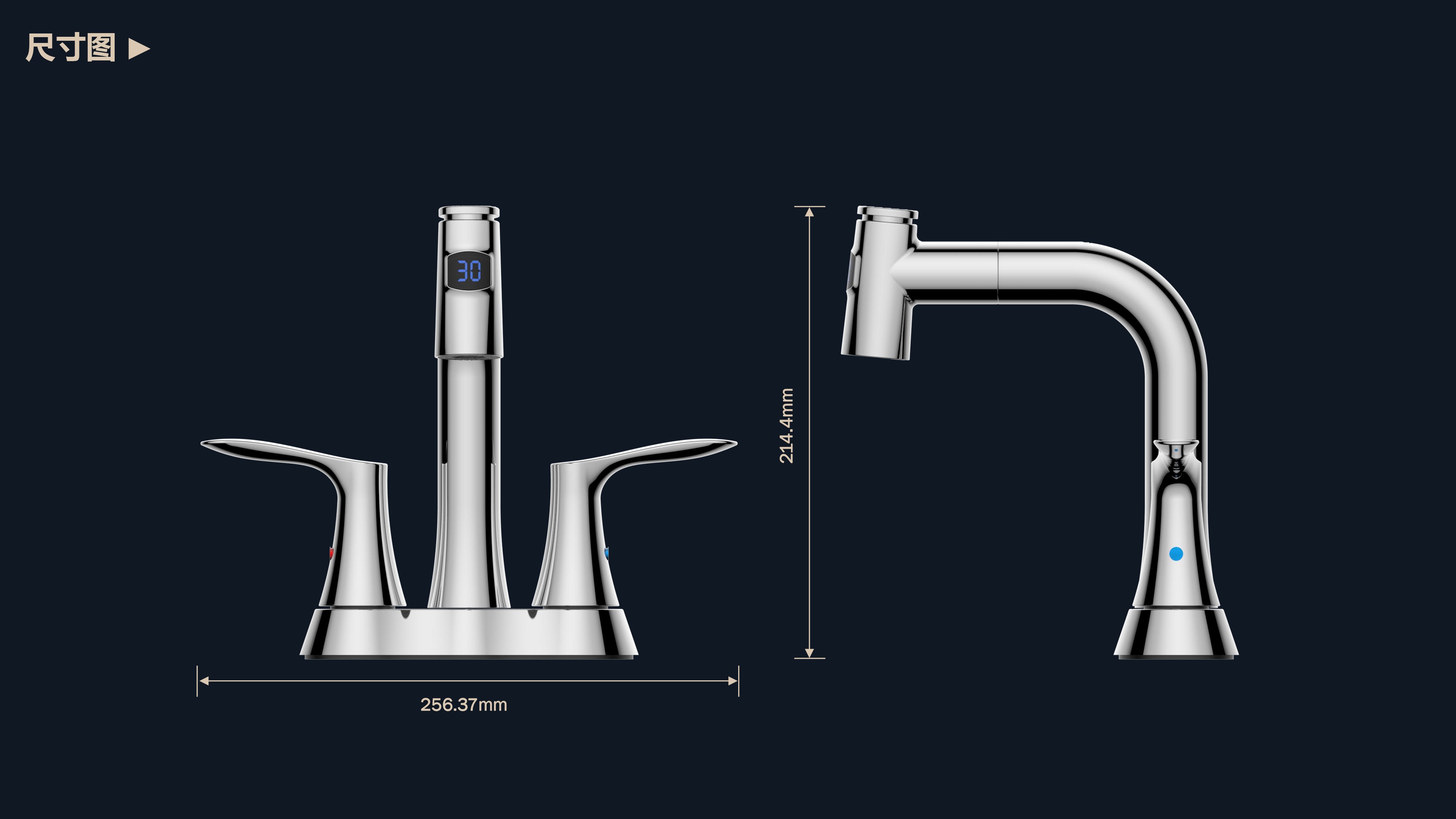 即時(shí)顯示溫度,安全防燙;日常洗頭利器,抽拉出水輕松洗;按壓切換兩功能水花;適合4寸3孔安裝臺(tái)面