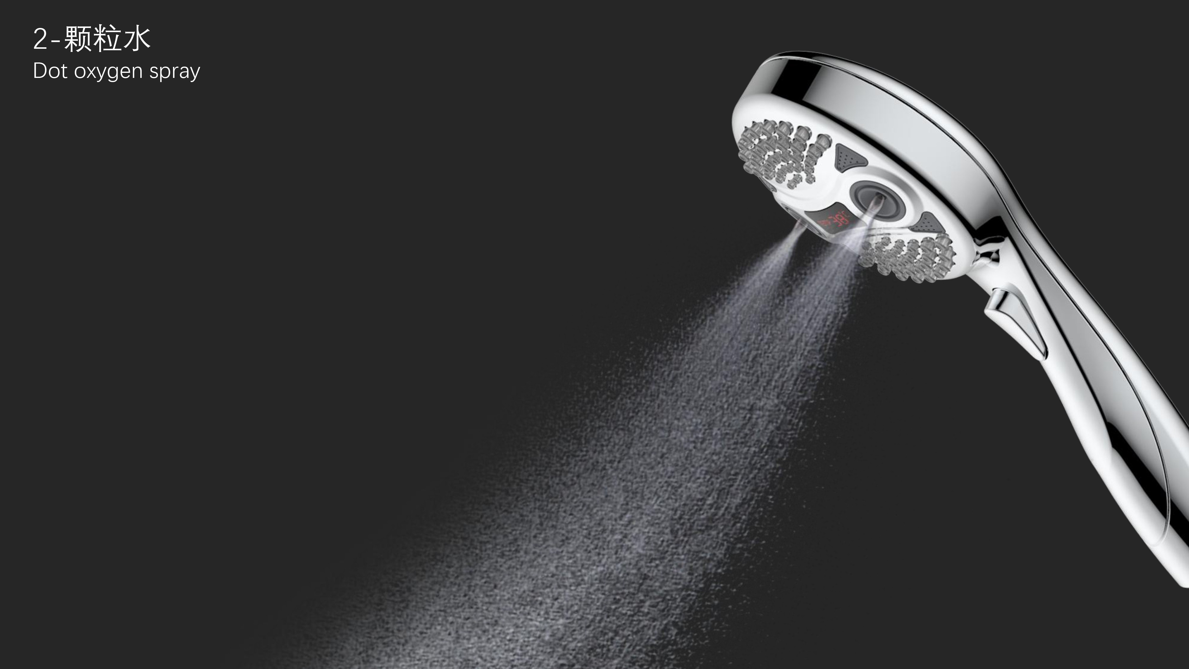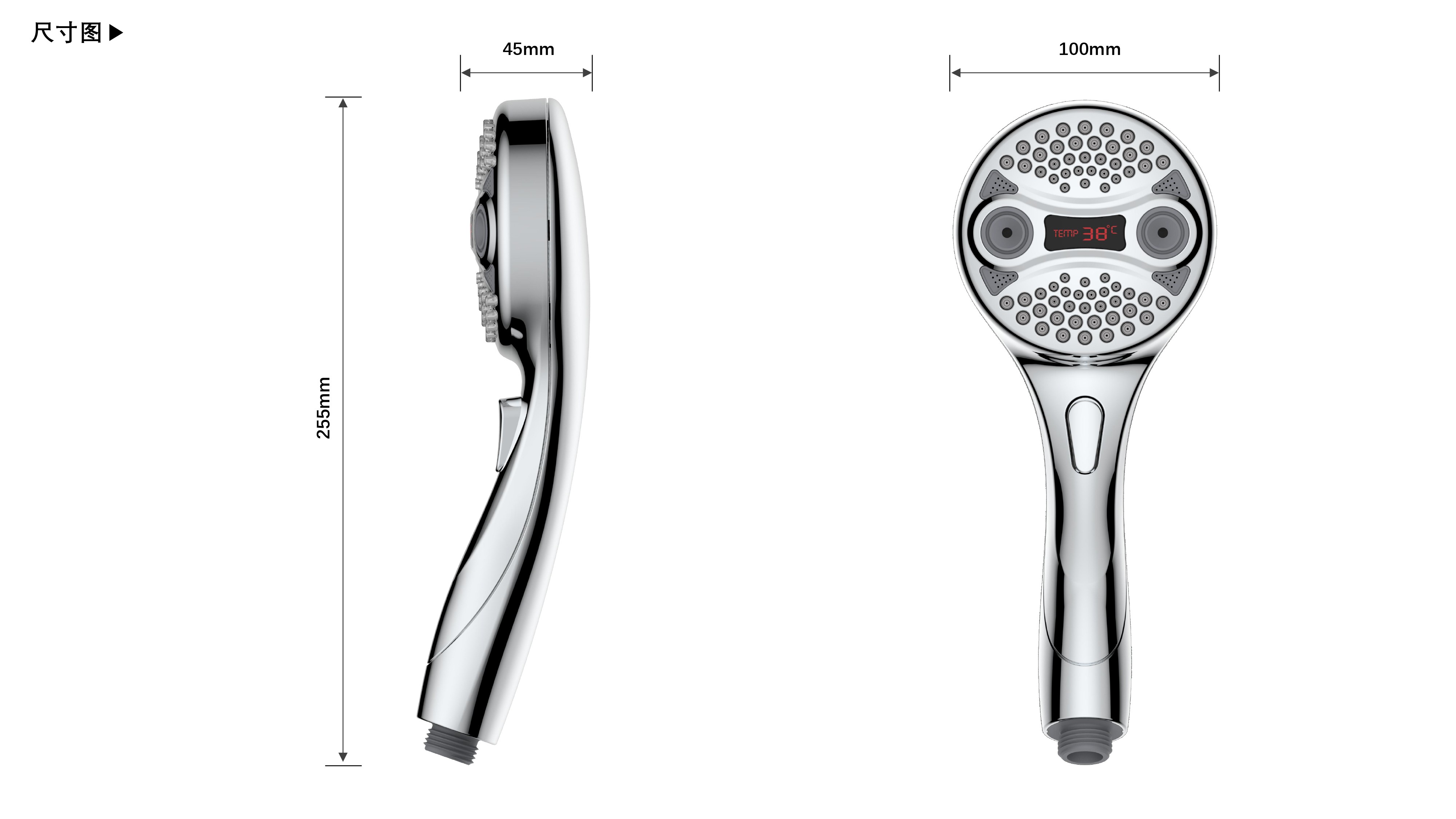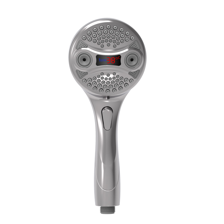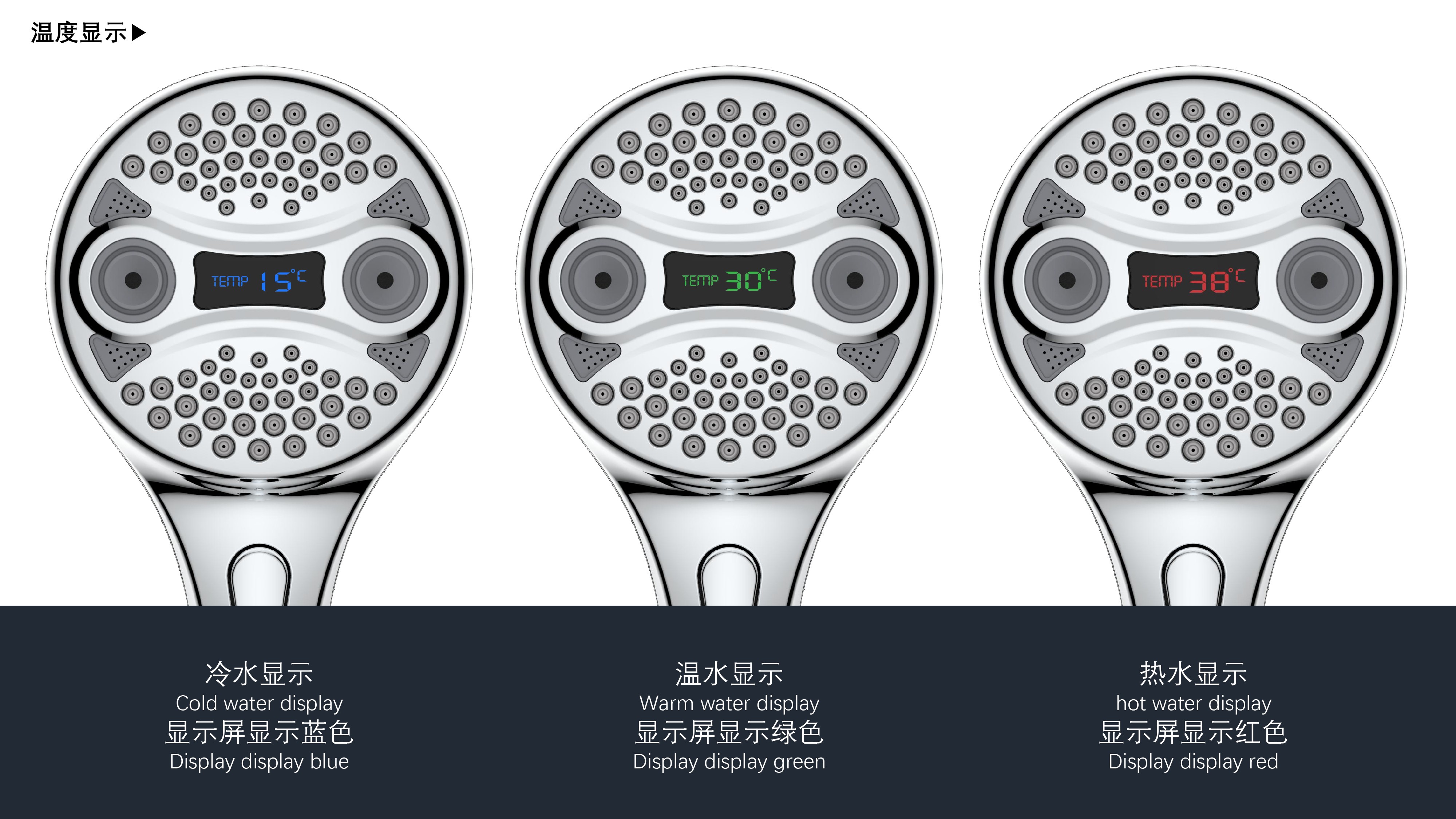 三功能溫顯花灑;獨特E.T.外觀設(shè)計;TPR出水孔,輕撥除垢;LED三色出水,看得見的水溫;按鍵切換三檔模式出水;握感舒適防滑