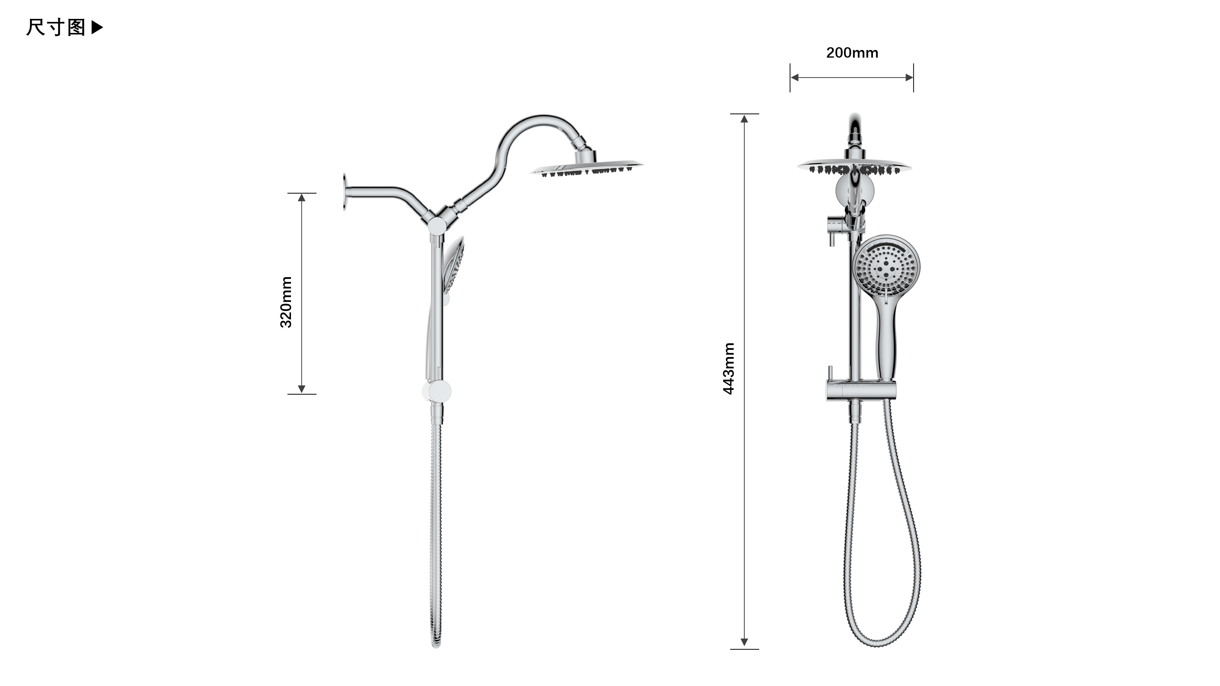 上出水彎管套裝;頂噴內(nèi)置球頭,可實現(xiàn)多角度旋轉(zhuǎn)調(diào)整;把手切換頂噴出水、花灑出水;轉(zhuǎn)動把手調(diào)節(jié)滑座高低