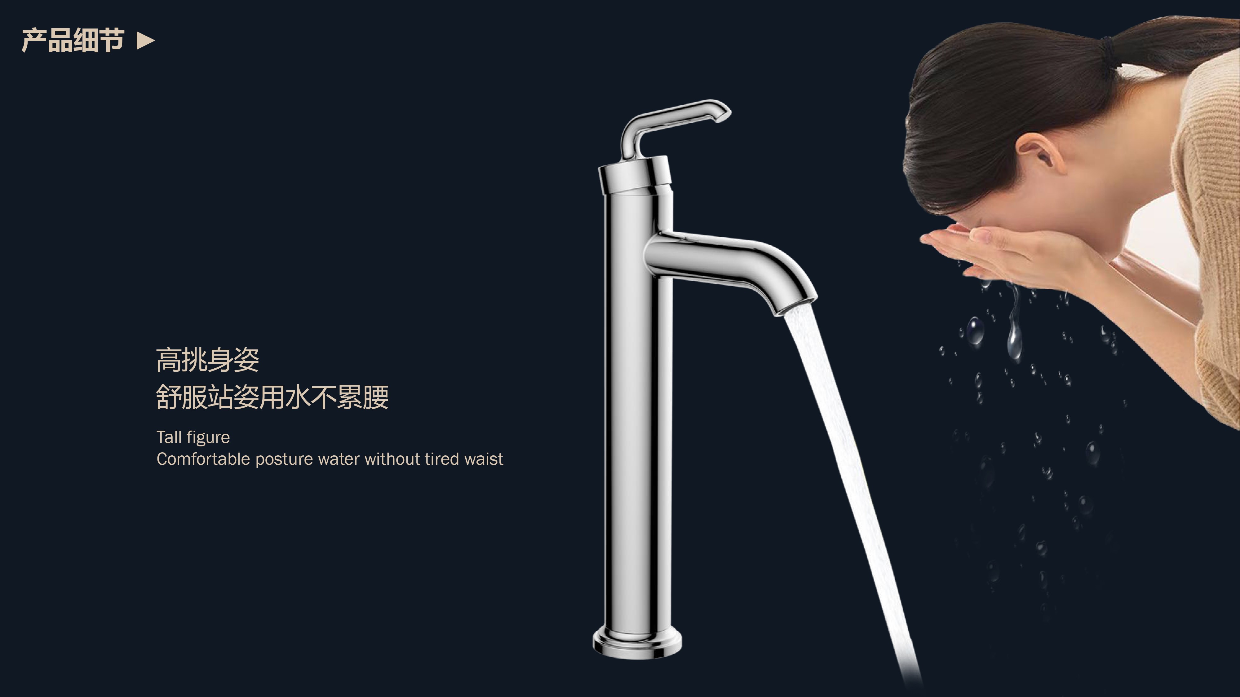 High posture, comfortable standing posture, not tiring waist with water; Detachable honeycomb bubbler, soft and non-splash water; Cold and hot dual control, smooth handle switch freely; Anti-leakage ceramic valve core, smooth and durable opening and closing; Without tools, push and screw, and install quickly in 10 seconds